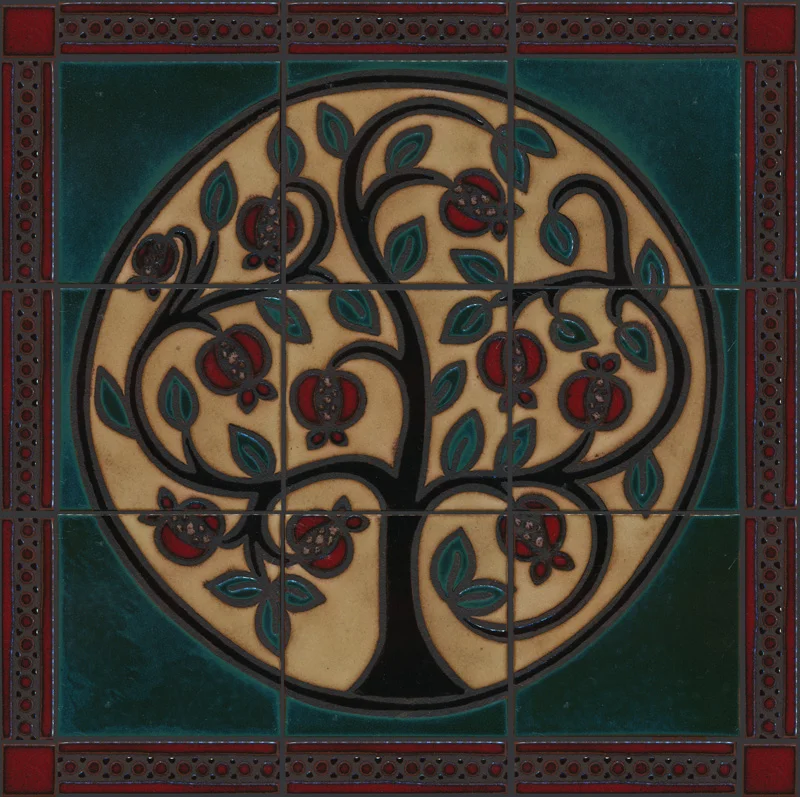 Pomegranate Mural in custom colors: Aqua, Ivory, Black Gloss, Sangria, Copper. Surrounded by Beaded Border 2x8